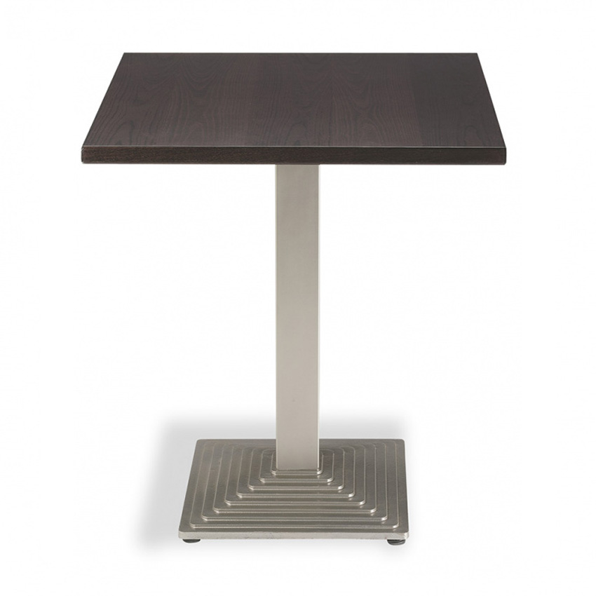 Mesa contract con base central de hierro fundido y columna metálica, diseñada para tableros cuadrados o rectangulares. Solución estable y resistente para proyectos de restauración y hotelería interior con altas exigencias de uso.