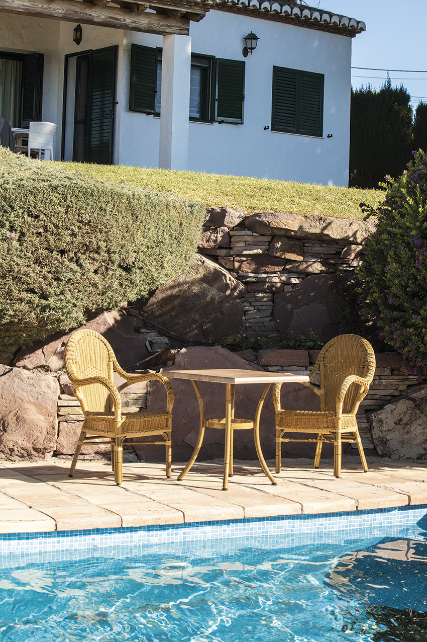 El color miel de su acabado aporta un toque cálido y natural, ideal para ambientes exteriores de restaurantes, bares o cafeterías que busquen transmitir cercanía, confort y un aire entre clásico y boho. Además, su diseño apilable facilita el almacenamiento y transporte.