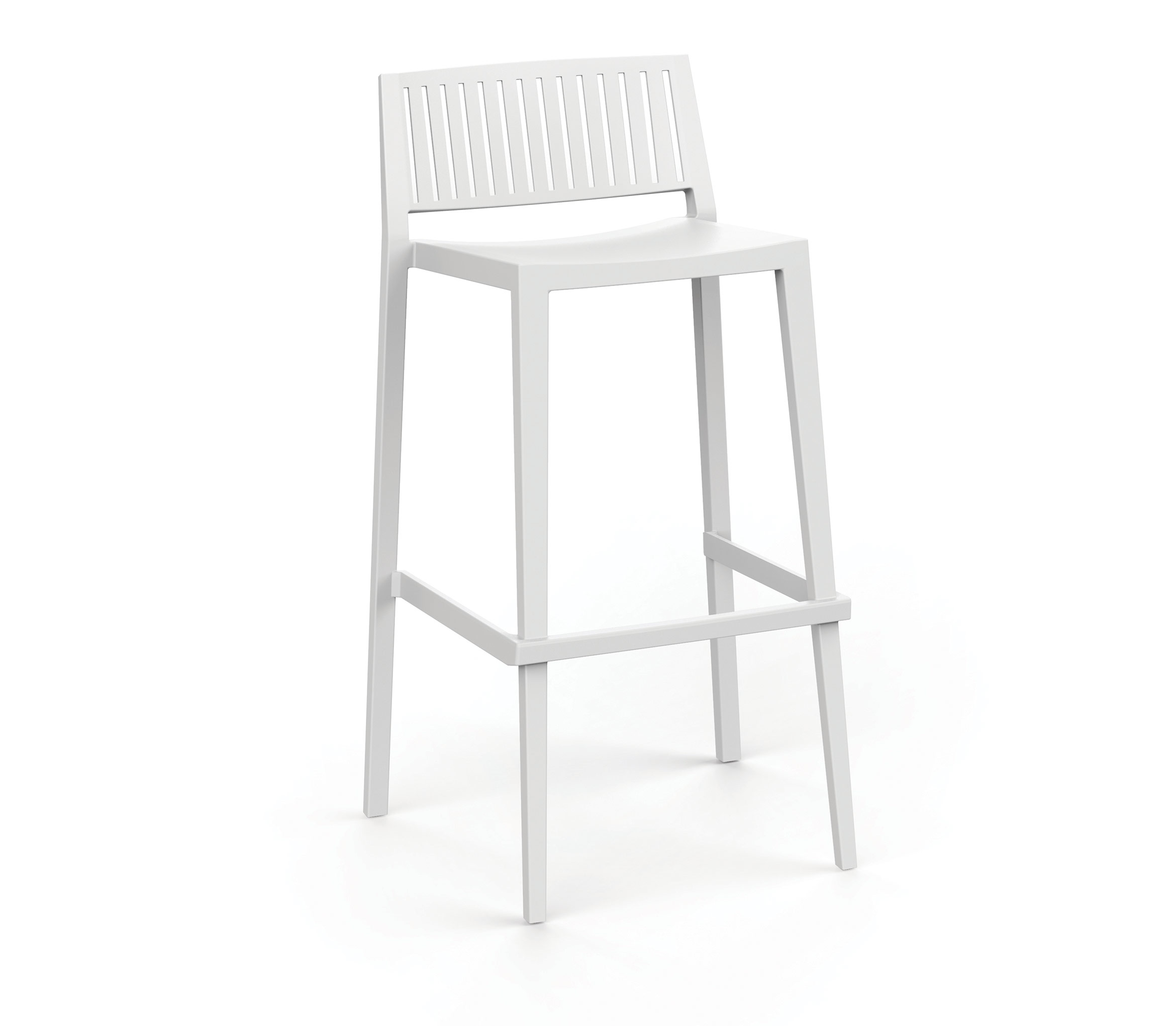 Taburete de diseño moderno con respaldo de lamas verticales, fabricado en polipropileno reforzado. Diseñado para barras interiores y exteriores, destaca por su estabilidad, resistencia y fácil limpieza en uso intensivo.