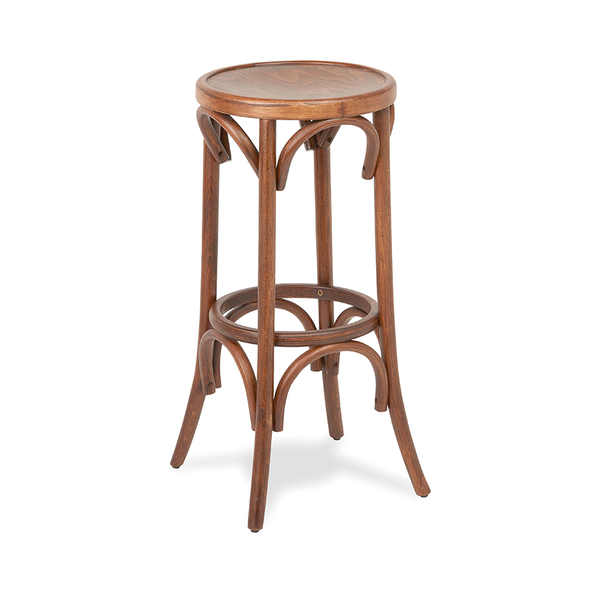 Taburete fabricado en madera de haya barnizada en color nogal. Compacto, funcional y de estética atemporal, está diseñado para adaptarse a barras de bar o mesas altas en restaurantes y cafeterías. Su estructura sólida y su acabado cálido garantizan comodidad y durabilidad en el uso diario, aportando un toque elegante y natural a los espacios de hostelería.