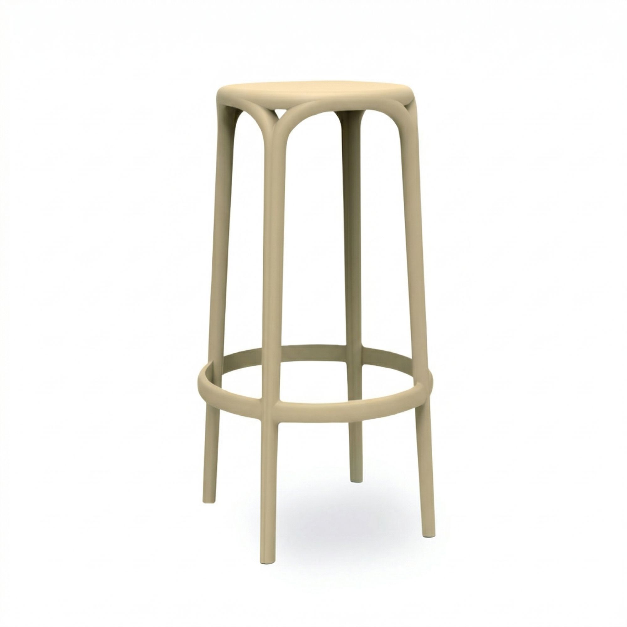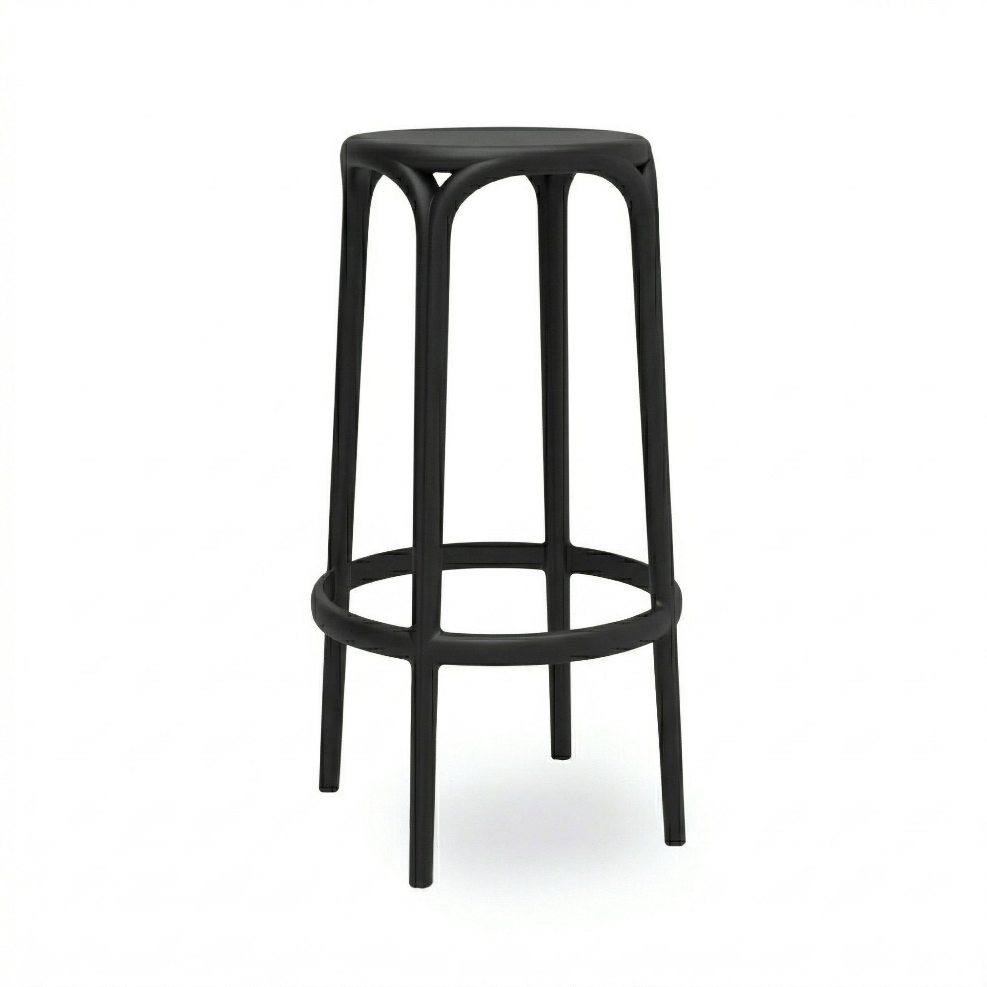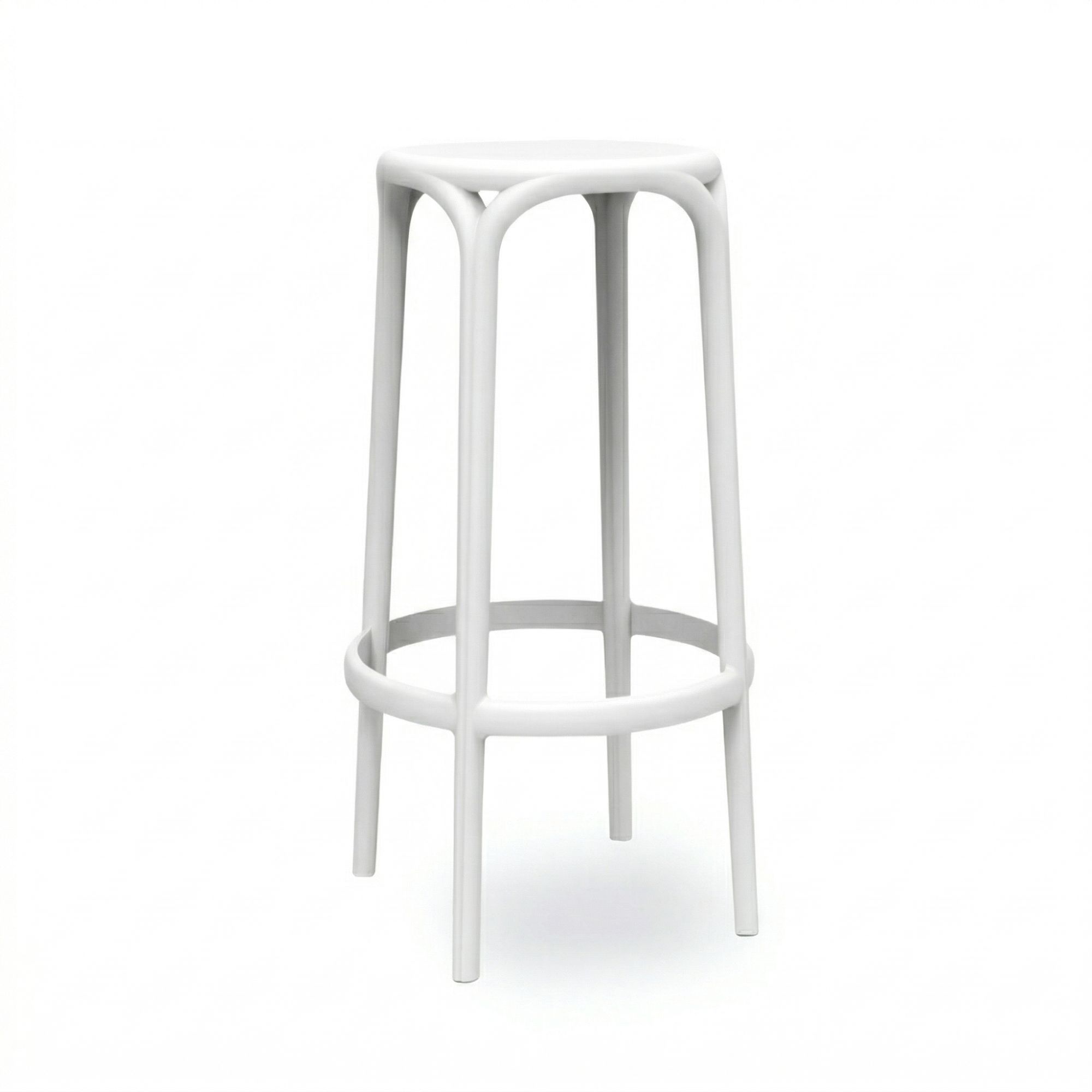 Taburete de diseño contemporáneo con estructura monobloc y líneas suaves, fabricado en polipropileno reforzado con fibra de vidrio. Ideal para barras interiores y exteriores que buscan una imagen moderna con máxima durabilidad.