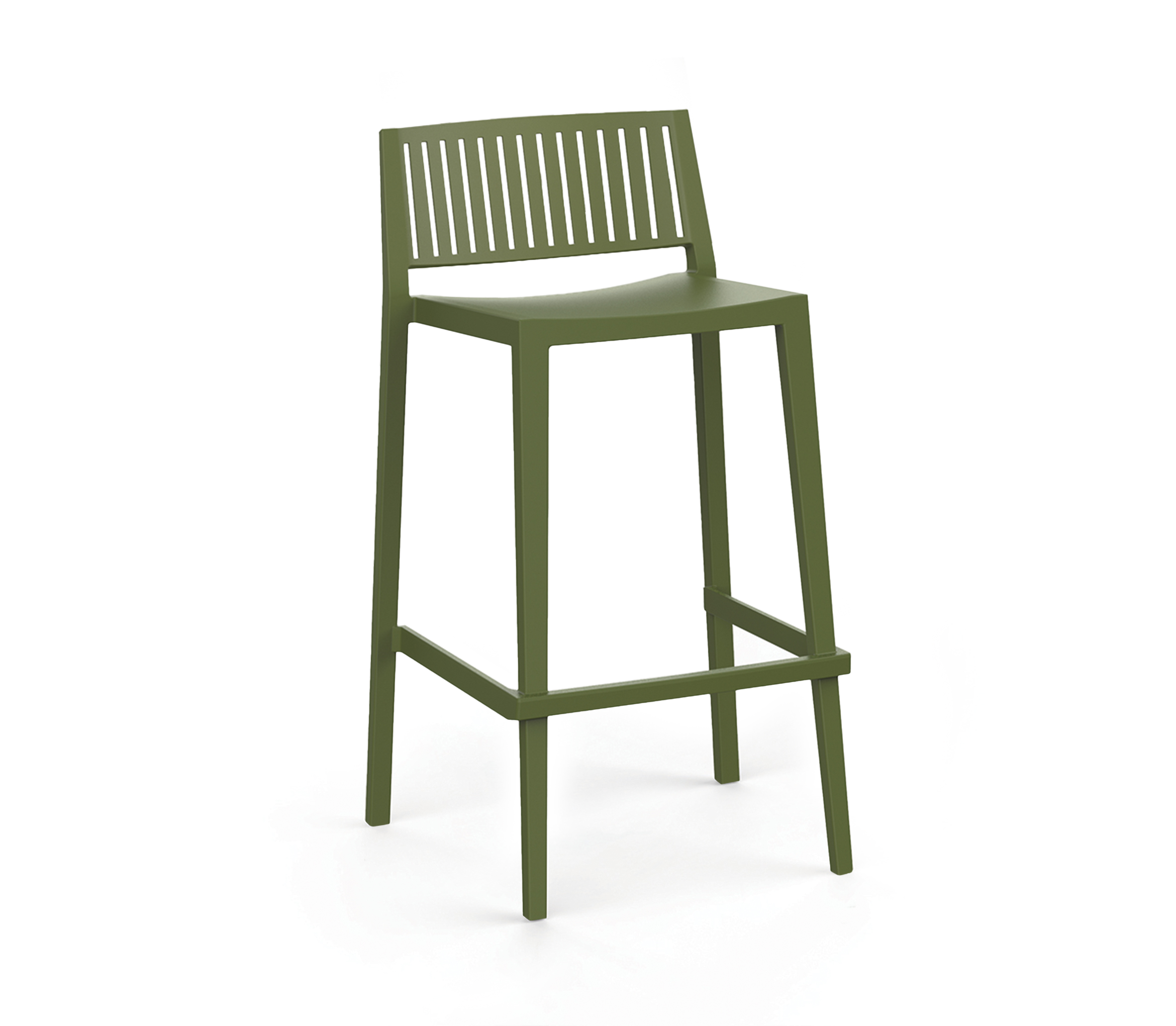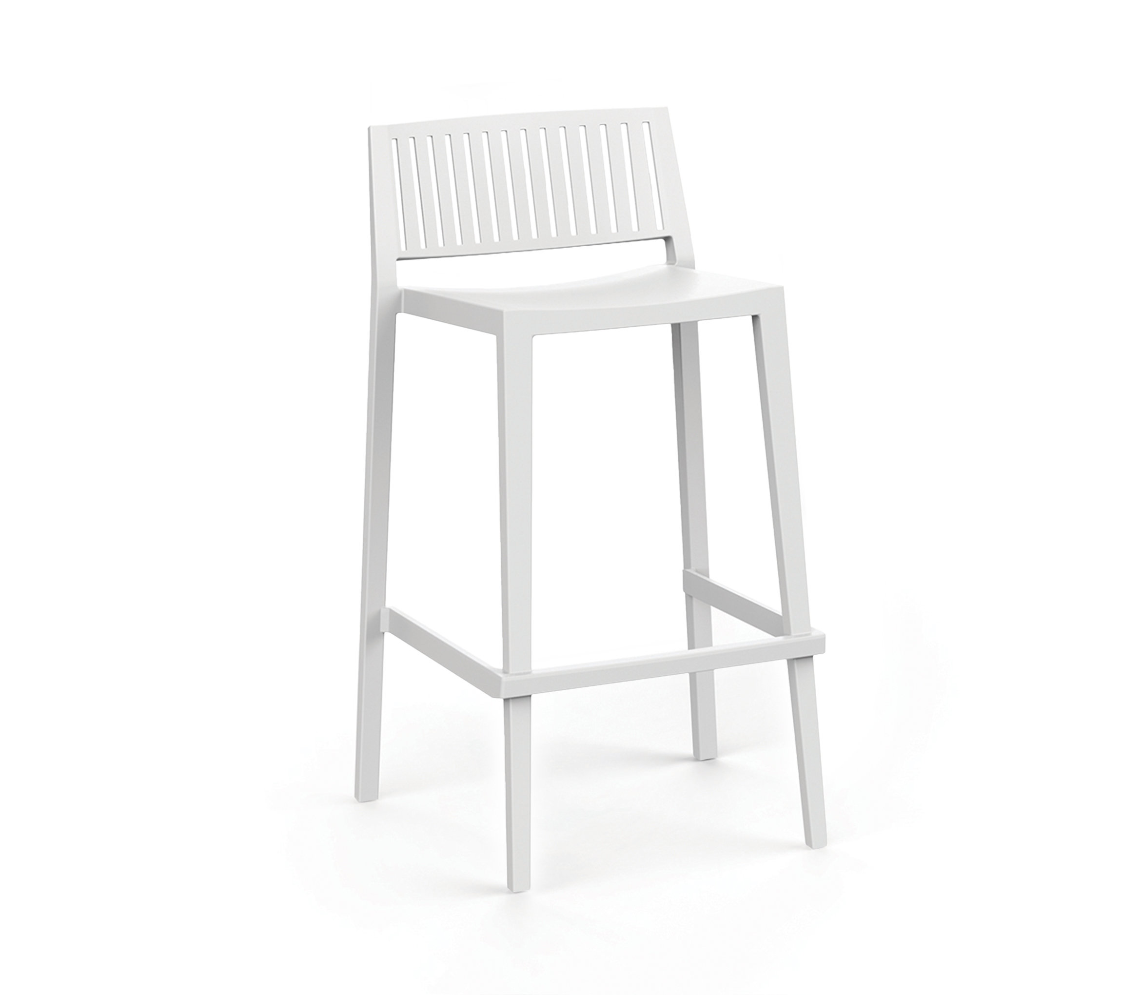 Taburete de diseño moderno con respaldo de lamas verticales, fabricado en polipropileno reforzado. Diseñado para barras interiores y exteriores, destaca por su estabilidad, resistencia y fácil limpieza en uso intensivo.