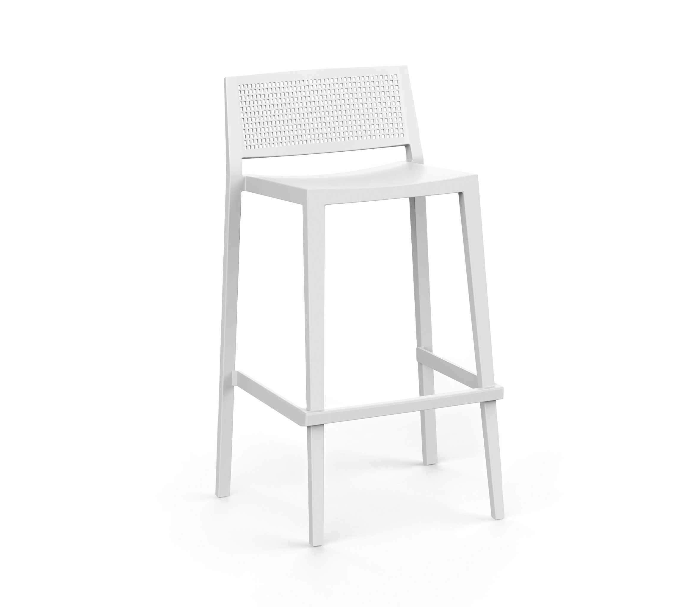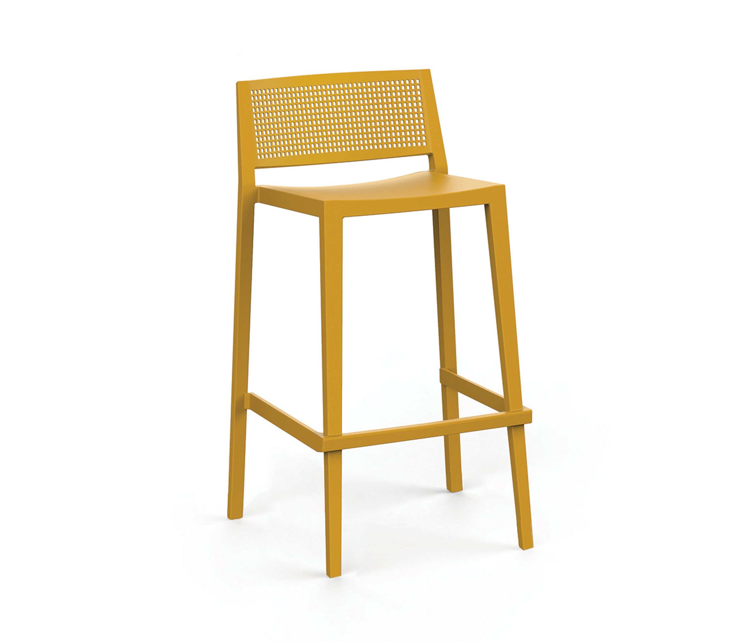 Taburete de diseño moderno con respaldo de lamas verticales, fabricado en polipropileno reforzado. Diseñado para barras interiores y exteriores, destaca por su estabilidad, resistencia y fácil limpieza en uso intensivo.